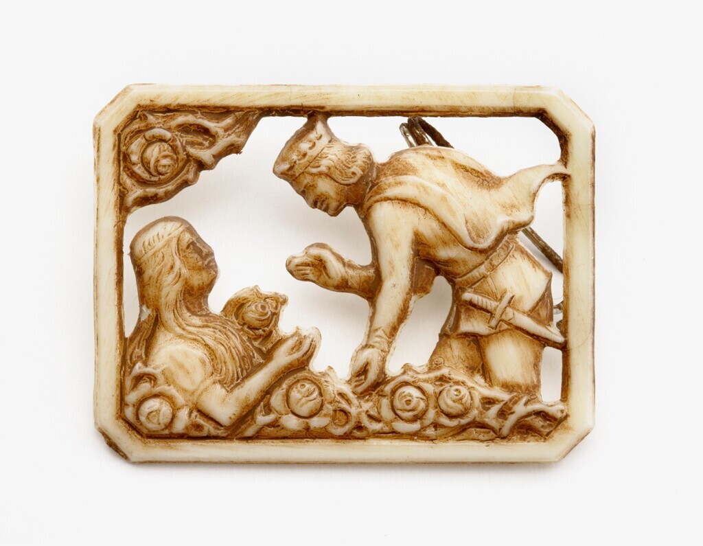 Een rechthoekige opengewerkt kunststof speldje, waarbij het materiaal op been lijkt. In de rechthoek zijn een vrouw en een man afgebeeld omringd door rozen. Het gaat hier om de sprookjesfiguren "Doornroosje" en de prins uit het gelijknamige sprookje". Het speldje werd uitgereikt in het kader van de actie "Winterhulp".