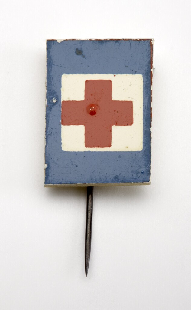 Een rechthoekig kunststof speldje met de afbeelding van een rood kruis op een wit veld binnen een breed blauw kader. Dit speldje was er een van een serie 'verkeersborden' uitgereikt tijdens de collecte voor de Winterhulp Nederland tussen 14 en 15 februari 1941.