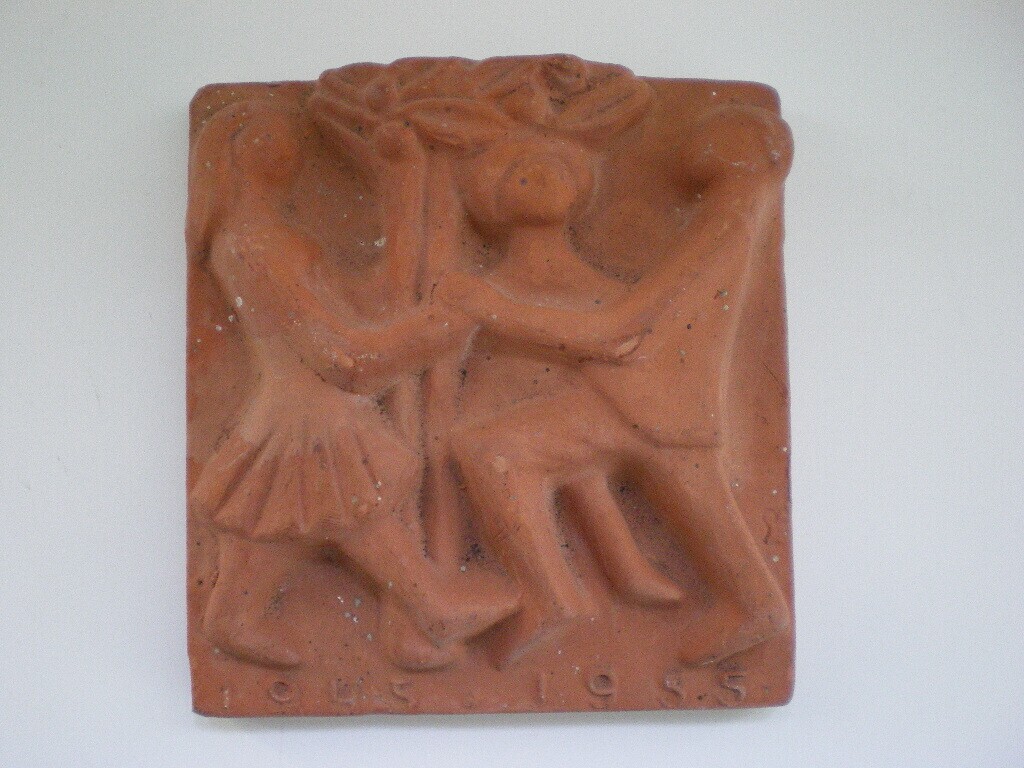 Een rossig aardewerken siertegel met in reliëf drie mensen die dansen rond de vrijheidsboom en daaronder: "1945 1955".