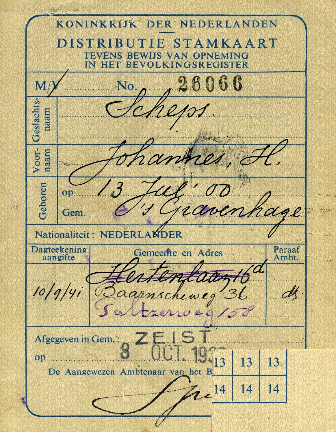 Een Distributie Stamkaart op naam van Johannes, H. Scheps, geboren te 's-Gravenhage op 13 juli 1900. De kaart is afgegeven te Zeist op 8 oktober 1939. Andere data: een aantekening bij een vermoedelijke adreswijziging: 10 september 1941 en een stempel met 24 september 1940. Rechtsonder is van het voorblad een rechthoekig stuk afgeknipt.
