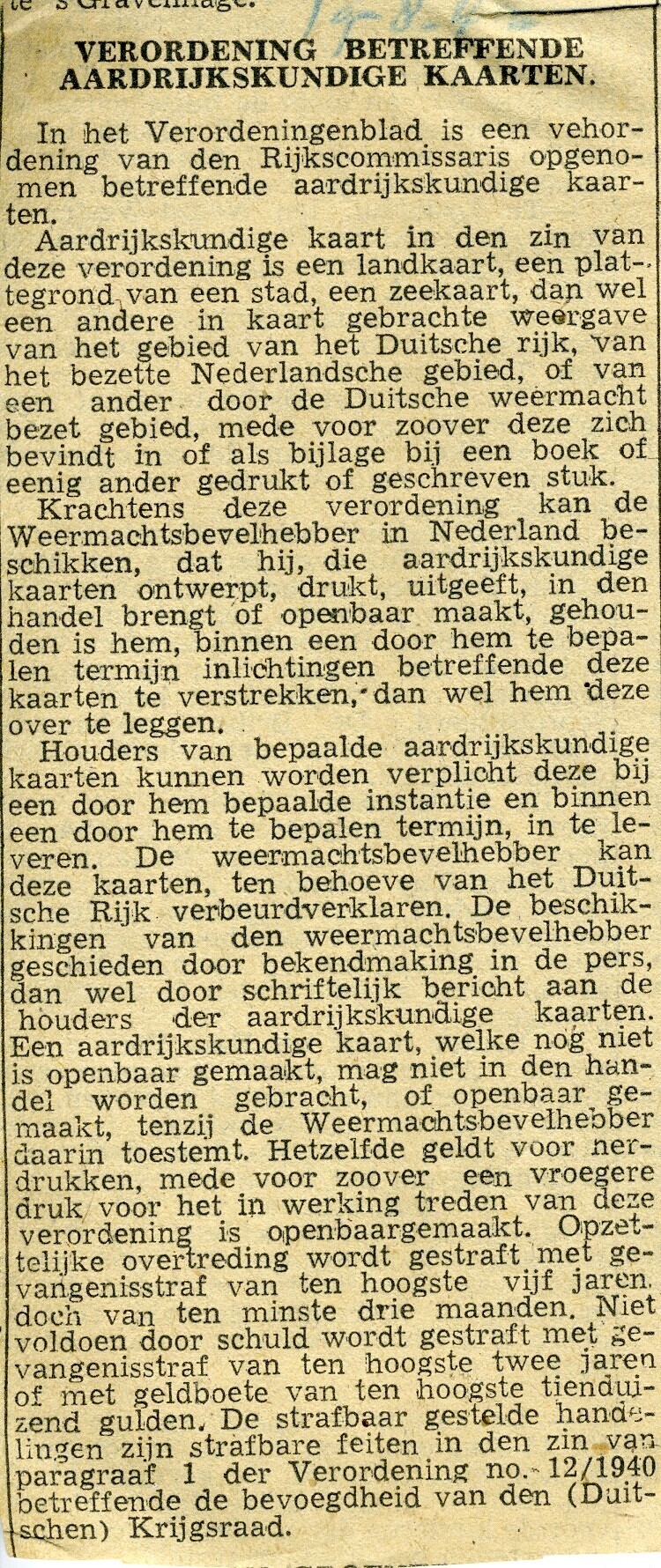 Een krantenartikel daterend van 19 augustus 1940 (?) handelend over de verordening betreffende aardrijkskundige kaarten. Onder andere moet men voor uitgave van aardrijkskundige kaarten de (Duitse) autoriteiten de kaarten voorleggen en om officiële toestemming vragen.