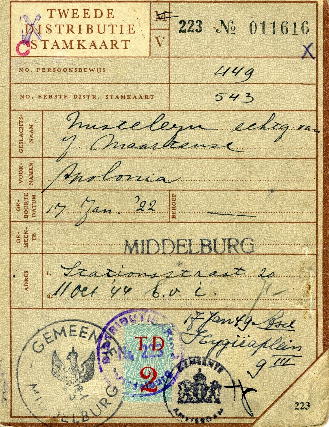 Een Tweede Distributie Stamkaart nummer 011616 op naam van Apolonia Nusteleijn echtenote van J. Maartense, geboren op 17 januari 1922, wonende aan de Stationsstraat 20 te Middelburg. Van het laatste blad zijn de rechterhoeken afgeknipt.