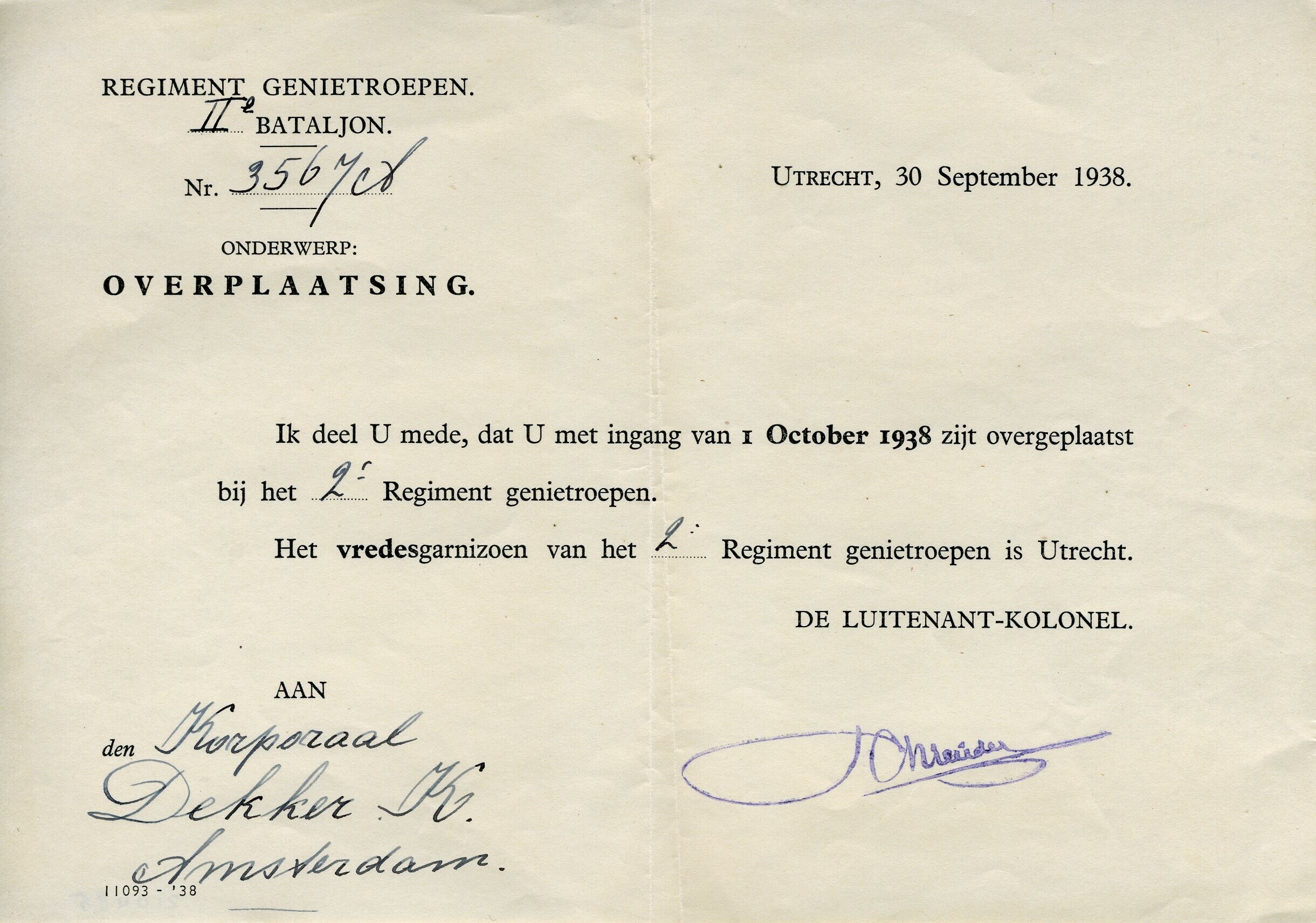 Een briefje van de Luitenant-Kolonel van het Regiment Genietroepen IIe Bataljon aan Korporaal K. Dekker te Amsterdam met de mededeling, dat hij met ingang van 1 oktober 1938 is overgeplaatst bij het vredesgarnizoen van het 2e Regiment Genietroepen te utrecht. Gedaan te Utrecht op 30 september 1938.