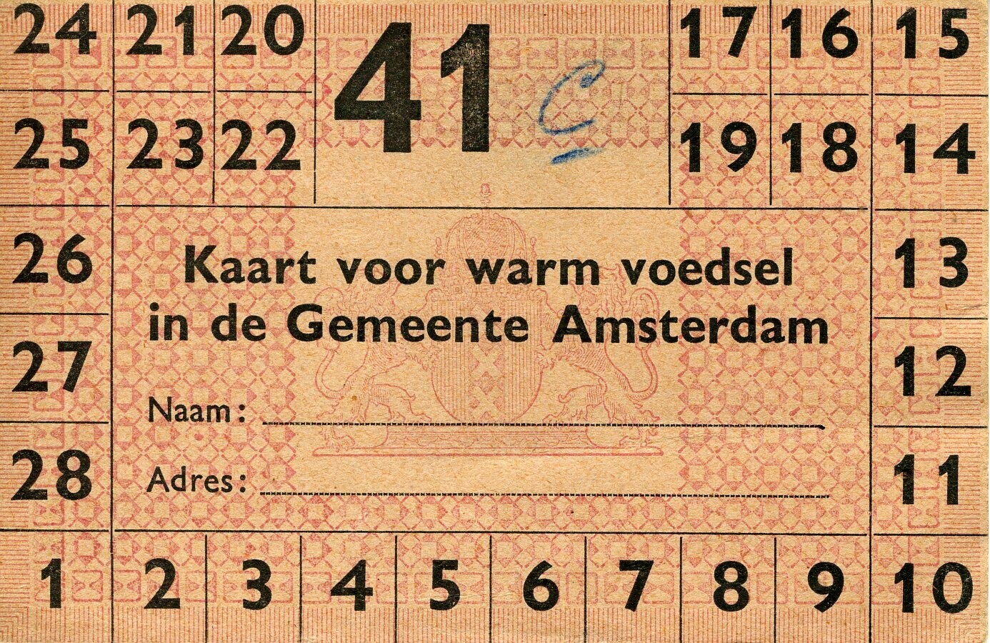 Een rozerood kaartje met op één kant "Kaart voor warm voedsel in de Gemeente Amsterdam" met op de achtergrond het wapen van Amsterdam en langs de rand een kader van de cijfers 1 t/m 28. De kaart zelf draag het nummer 41. Op de andere kant o.a.: "Op vertoon van deze kaart zal bij voorkomenden noodtoestand dagelijks een portie warm voedsel worden verstrekt. De kosten, de eventueel in te leveren levensmiddelenbonnen en de tijd van afgifte zullen te zijner tijd worden bekend gemaakt. uitgifteplaats: Oranje Vrijstaat 1".