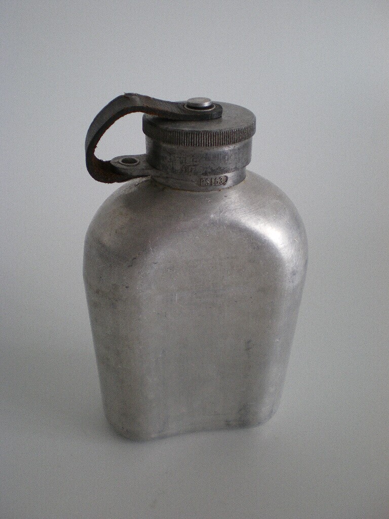 Een aluminium veldfles met schroefdop. Aan de dop en de fles is een leertje bevestigd. Op de hals: "PSL63."