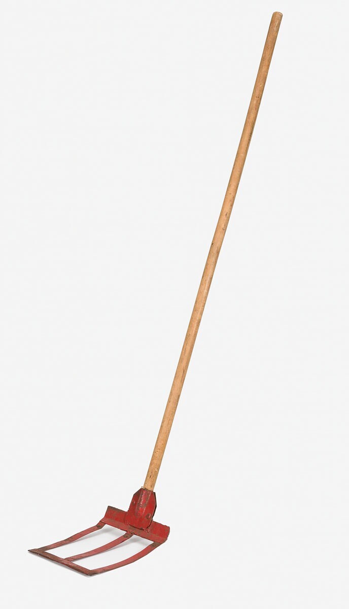 Een Duitse schep met houten steel en metalen rood gelakte opengewerkt blad bedoeld om brandbommen uit het huis te werpen.