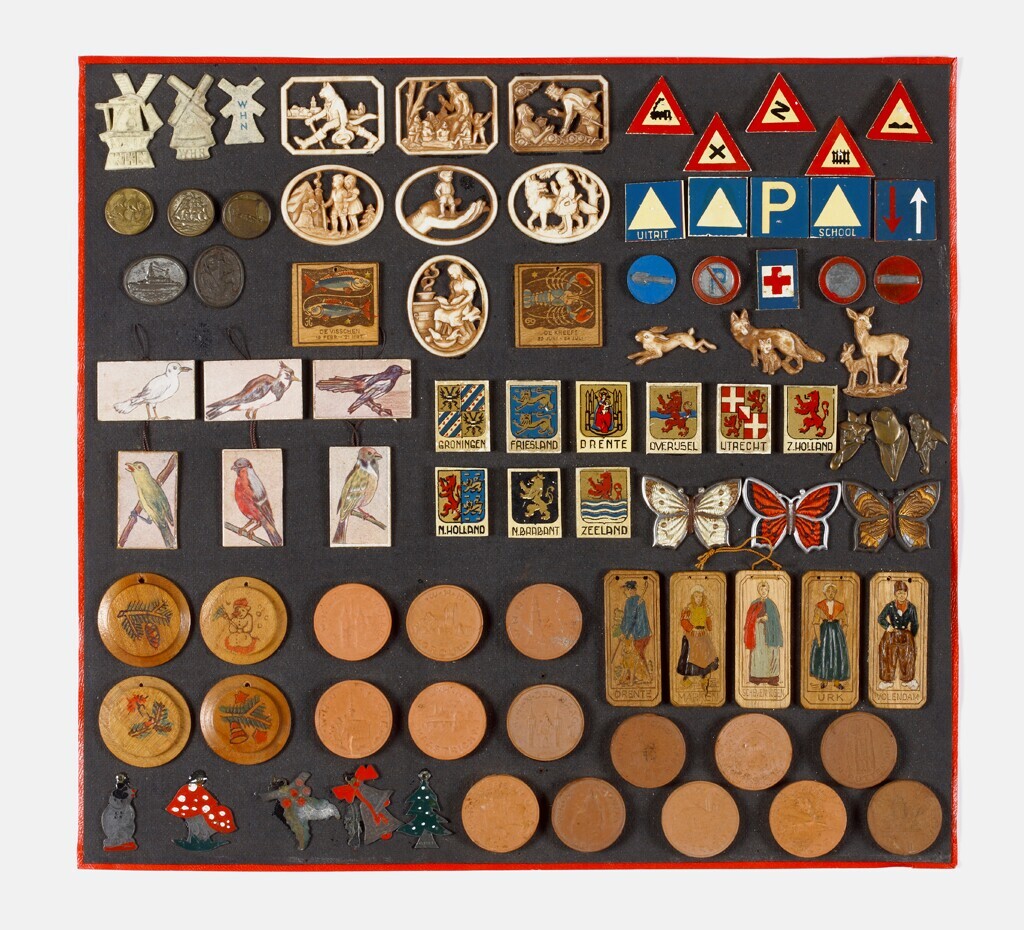 Een verzameling van 84 Winterhulpspeldjes in verschillende vormen en materialen vastgemaakt op een stuk zwart dik papier met rood papieren rand. Het gaat o.a. om de volgende collectes waarvoor een speldje werd uitgereikt: molens (29 en 30 november 1940); sprookjes (27 en 28 december 1940); verkeersborden (14 en 15 februari 1941); schepen ( 28 februari en 1 maart 1941); bloemen (2 en 3 mei 1941); provinciewapens (17 en 18 oktober 1941); bekende gebouwen (14 en 15 november 1941); Kerstmis (22 en 23 december 1941); klederdrachten (21 en 23 november 1942); Kerstmis (23 en 24 december 1942); dierenriem (16 en 18 januari 1943); vogels (20 - 22 februari 1943). Blijven over de bosdieren uitgereikt bij een collecte van het Winterhilfswerk in Mecklenburg-Vorpommern in januari 1941 en vlinders. Deze laatsten zijn vermoedelijk ook van de Winterhulp Duitsland.