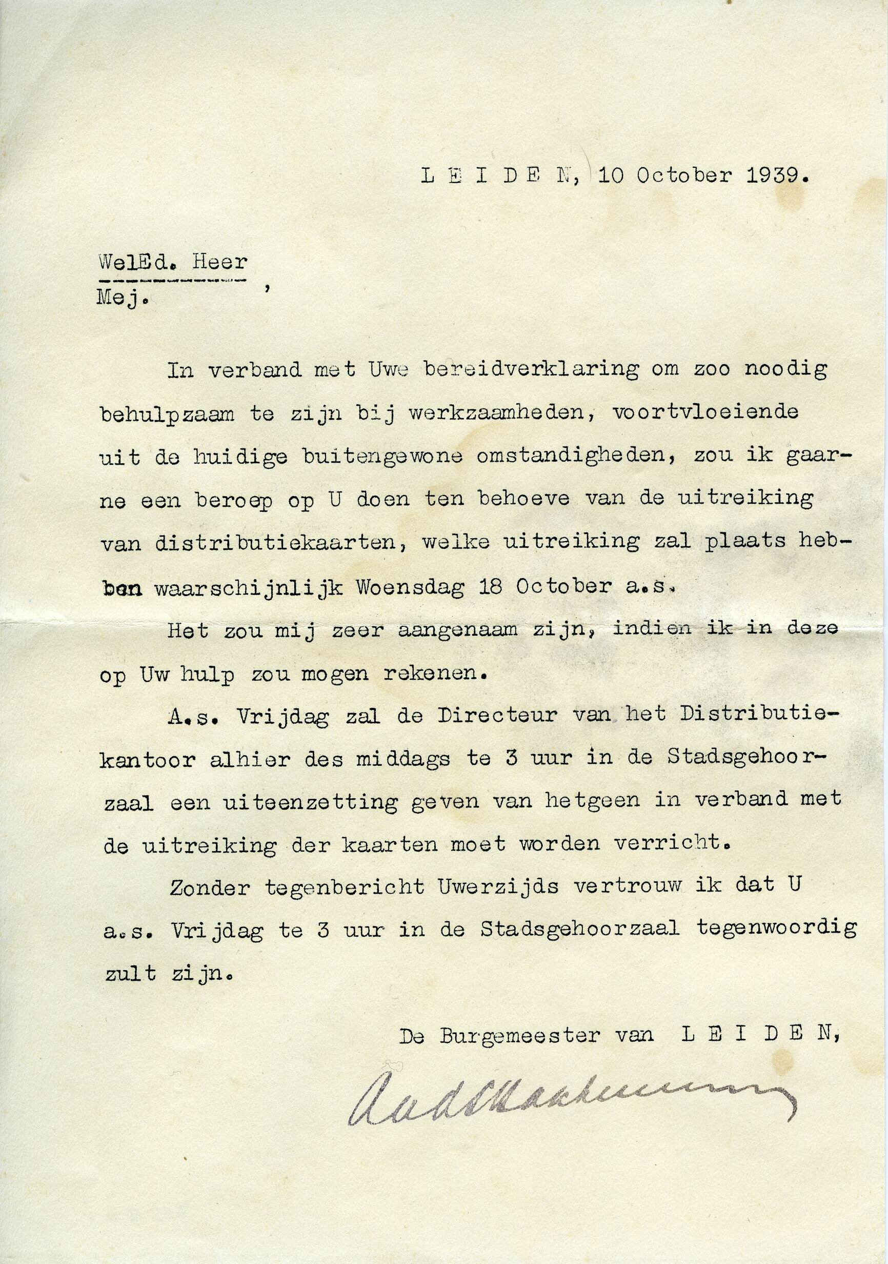 Een getypte brief met datering Leiden, 10 Oktober 1939 met een verzoek mee te helpen aan de uitreiking van distributiekaarten op woensdag 18 Oktober 1939. Hiervoor worden betrokkenen uitgenodigd voor een uiteenzetting in de Stadsgehoorzaal door de Directeur van het distributiekantoor.
