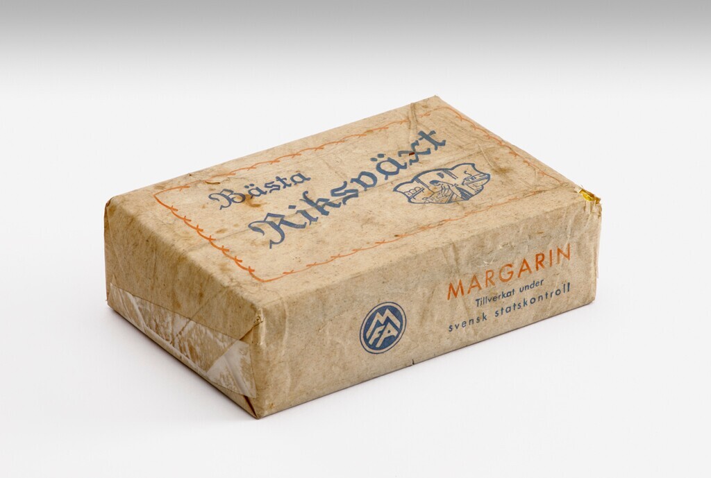 Wikkel van de Zweedse margarine Bästa Riksväxt. De merknaam staat in blauwe letters in een rood omlijnd kader met daarin een tekening van een vrouw met schort achter het aanrecht, waar zij roert in een kom.