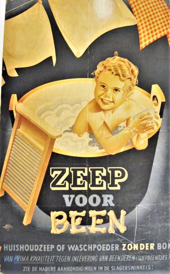 Een affiche met de afbeelding van een kind in een tobbe en: "Zeep voor been. Huishoudzeep of waschpoeder zonder bon van prima kwaliteit tegen inlevering van beenderen (soepbeentjes). Zie de nadere aankondigingen in de slagerswinkels!"