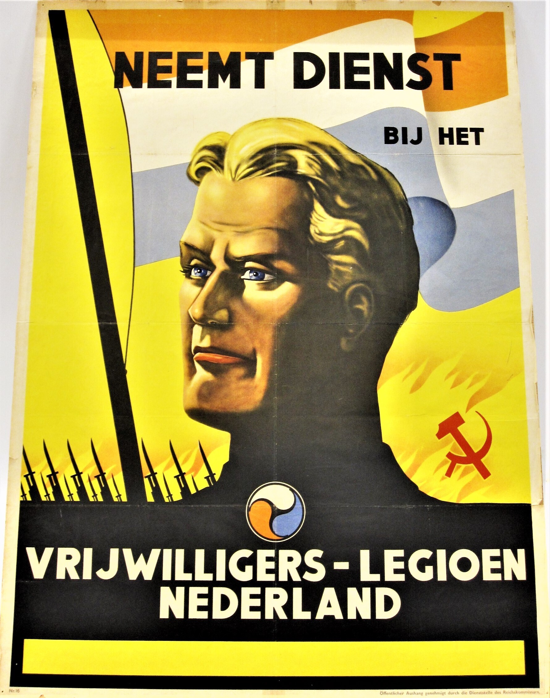 Affiche met de afbeelding van een mannenhoofd met daarachter de Prinsenvlag. Links van de man een rij met geweren zoals vastgehouden door marcherende soldaten. Rechts van de man de communistische hamer en sikkel afgebeeld in vlammen. Op het affiche de tekst: "Neemt dienst bij het Vrijwilligers-legioen Nederland. Onder de afbeelding: "Nr. 16. Öffentlicher Aushang genehmigt durch die Dienststelle des Reichkommissars."