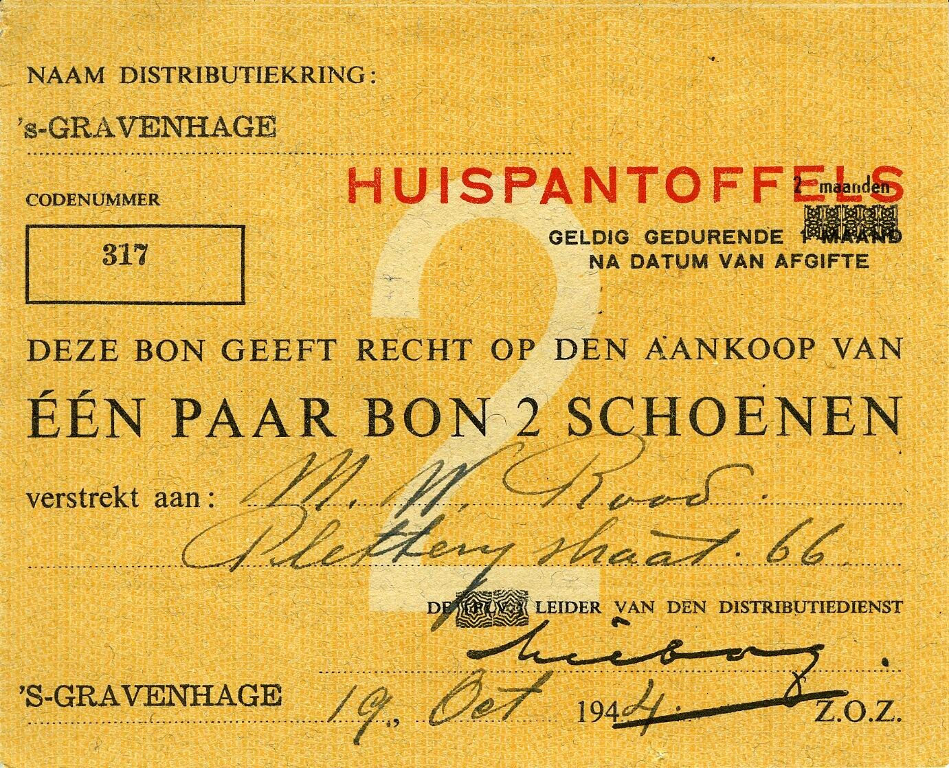 Een bon voor 'huispantoffels' uitgegeven op naam van M.W. Rood, Pletterijstraat 66, Den Haag door de distributiekring 's-Gravenhage.