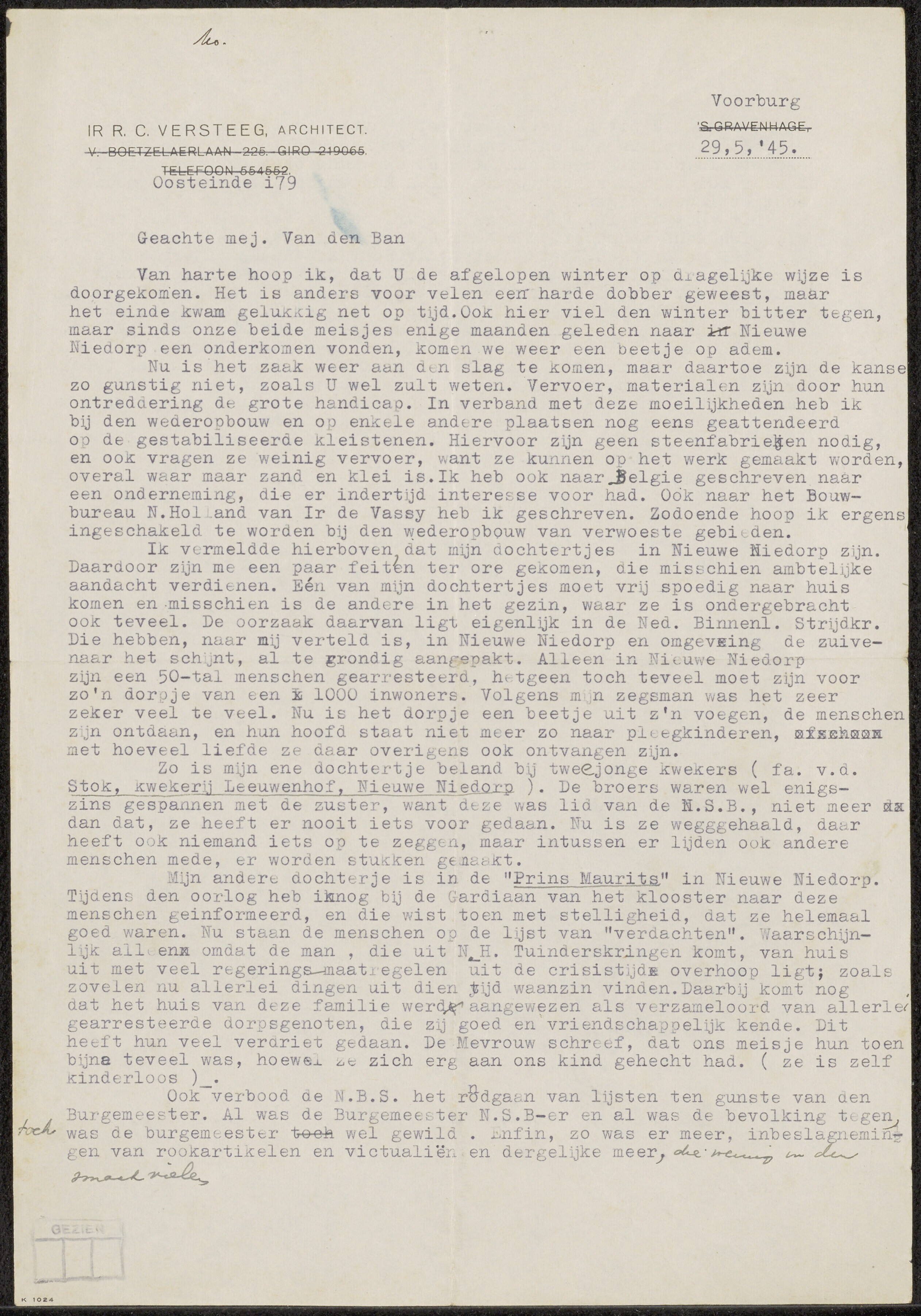 Brief van de architect R.C. Versteeg te Voorburg, gedateerd 29 mei 1945, met als onderwerpen: de mogelijkheid om gestabiliseerde kleistenen voor de wederopbouw te gebruiken (hiervoor zijn geen steenfabrieken nodig), de noodzaak voor zijn in pleeggezinnen ondergebrachte kinderen om naar huis terug te keren (de helft van de inwoners van Nieuwe Niedorp, waar zij zijn ondergebracht, is opgepakt wegens lidmaatschap van de N.S.B.). De brief behelst een verzoek de zaak bij de Griffie ter sprake te brengen en voor het vervoer van een van zijn dochters te zorgen.