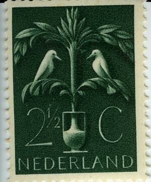 Een groene postzegel "Nederland 2 1/2 C" met de afbeelding van twee vogels aan weerszijden van een floraal motief. Het gaat om de levensboom met twee zonnevogels als symbool van het leven van de mens en van de wereld. De boom is te vinden als gestileerd ornament boven Nederlandse deuren op het bovenlicht. Hij staat op een heuvel omringd door water. Dit is vervangen door een waterkruik. De postzegel behoort tot een serie van zeven postzegels met 'Germaanse symbolen' ontworpen door Pyke Koch onder toeziend oog van de Duitse bezetter.