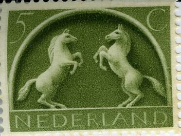 Een lichtgroene postzegel "Nederland 5 C" met twee steigerende paarden onder een architecturale boog. Het gaat om Saksische schimmels die staan symbool voor levenskracht. De postzegel behoort tot een serie van zeven postzegels met 'Germaanse symbolen' ontworpen door Pyke Koch onder toeziend oog van de Duitse bezetter.