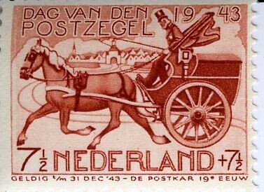 Een bruinrode postzegel met de afbeelding van een postkoets getrokken door één paard. Op de postzegel: "Dag van den postzegel 1943".