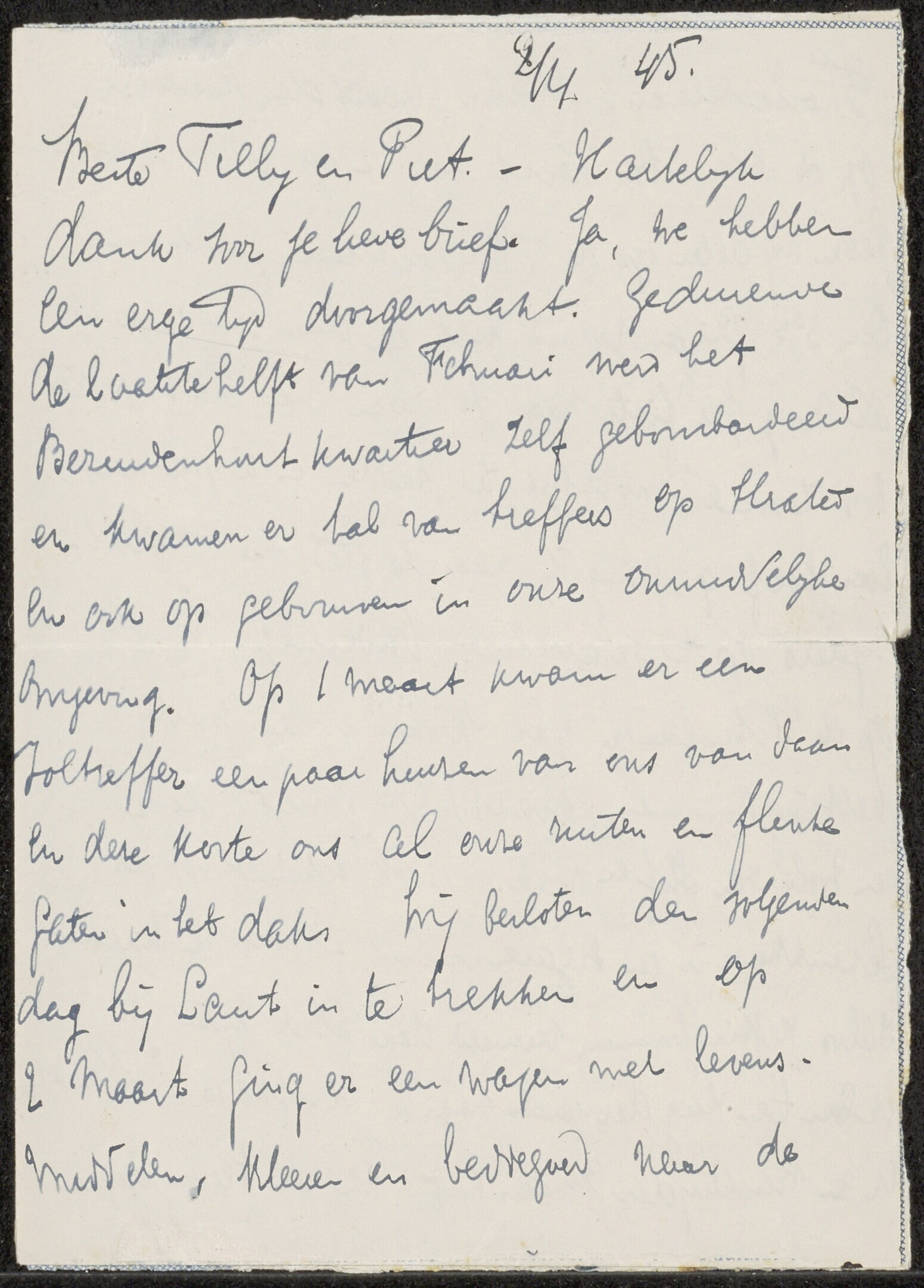 Handgeschreven brief, gedateerd 2 april 1945 over onder meer het bombardement op het Haagse Bezuidenhout.