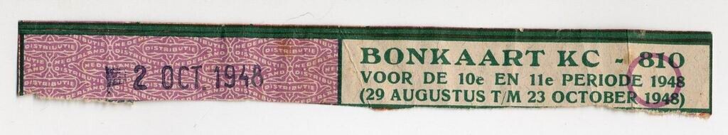 De bovenste strook van een gebruikte bonkaart KC 810 - voor de 10e en 11e periode 1948 (29 aug. t/m 23 oct. 1948) met paarse en groene opdruk. De strook is afgestempeld op 2 oktober 1948.