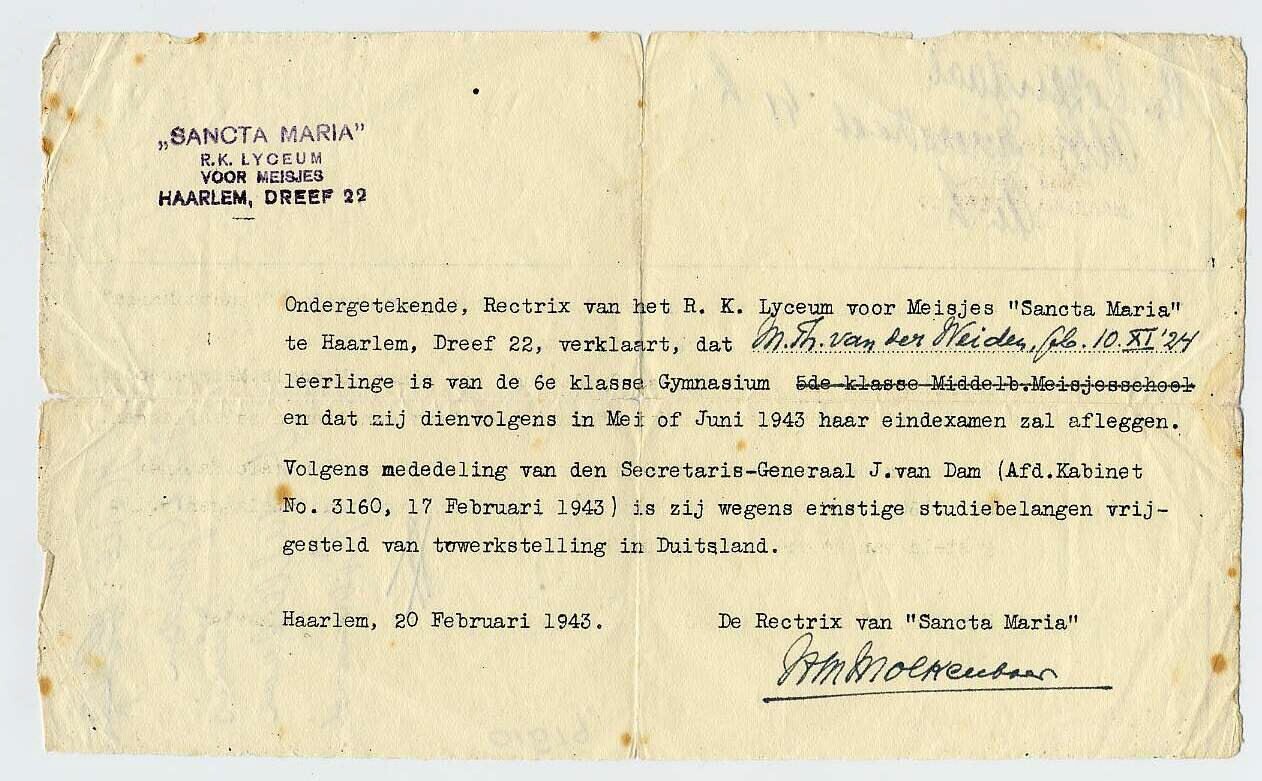 Gestencild en verder met pen ingevuld schrijven waarmee de rectrix van het R.K. Lyceum "Sancta Maria" te Haarlem verklaart dat M. Th. van der Weiden in mei of juni 1943 haar eindexamen zal afleggen en derhalve niet in Duitsland tewerkgesteld kan worden.