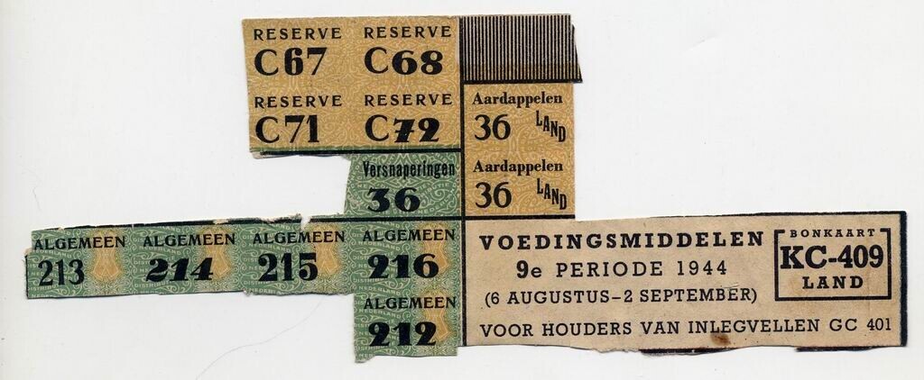 Gedeelte van een gebruikte bonkaart KC-409 Land - Voedingsmiddelen 9e periode 1944 - (6 augustus - 2 september) voor houders van inlegvellen GC 401 - met zwarte, groene en gele opdruk.