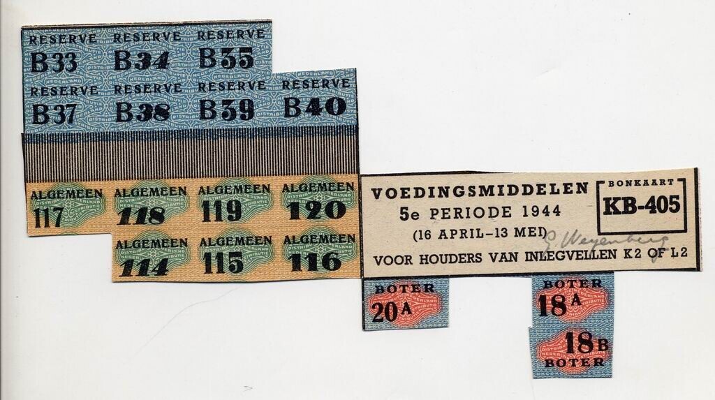Gedeelte van een gebruikte bonkaart KB-405 Land - Voedingsmiddelen 5e periode 1944 - (16 april - 13 mei) voor houders van inlegvellen K 2of L 2 - met zwarte, groene, blauwe, roze en gele opdruk. Met potlood de naam G. Meyenberg.