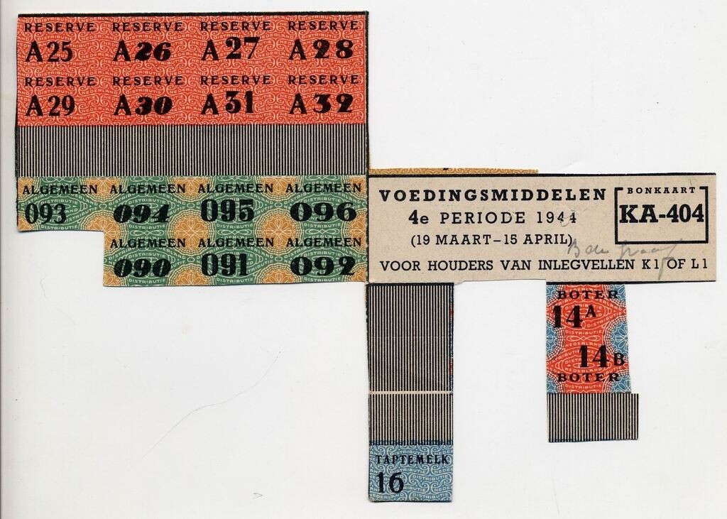 Gedeelte van een gebruikte bonkaart KE-404 Land - Voedingsmiddelen 4e periode 1944 - (19 maart - 15 april) voor houders van inlegvellen K 1 of L 1 - met zwarte, groene, blauwe, roze en gele opdruk. Met potlood de naam B. de Graaf en Mevr. M. Philipsen.