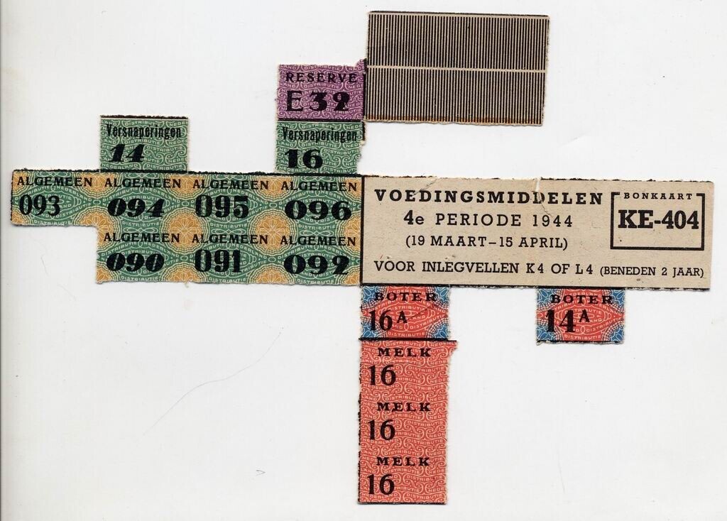 Gedeelte van een gebruikte bonkaart KE-404 Land - Voedingsmiddelen 4e periode 1944 - (19 maart - 15 april) voor houders van inlegvellen K 4 of L 4 (beneden 2 jaar) - met zwarte, groene, blauwe, roze, paarse en gele opdruk.