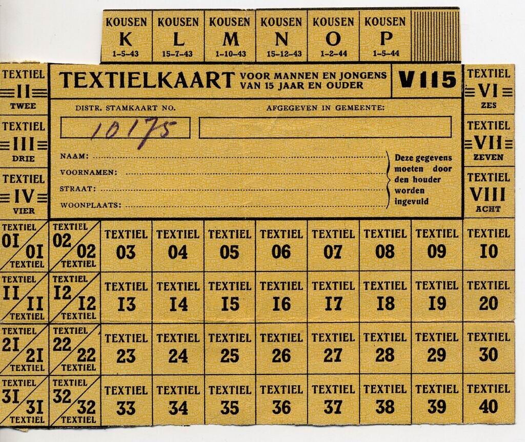 Gedeelte van een gebruikte bonkaart V 115 - Textielkaart voor mannen en jongens van 15 jaar en ouder - bonnen voor 1943 en 1944 - met zwarte en gele opdruk.