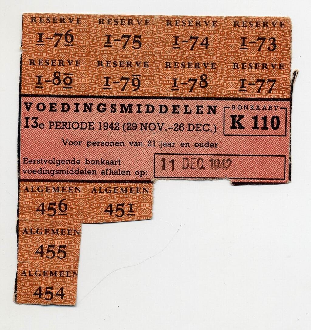 Gedeelte van een gebruikte bonkaart K 110 - Voedingsmiddelen 13e periode 1942 (29 nov. - 26 dec.) - Voor personen van 21 jaar en ouder. - met zwarte, rode en oranje opdruk.