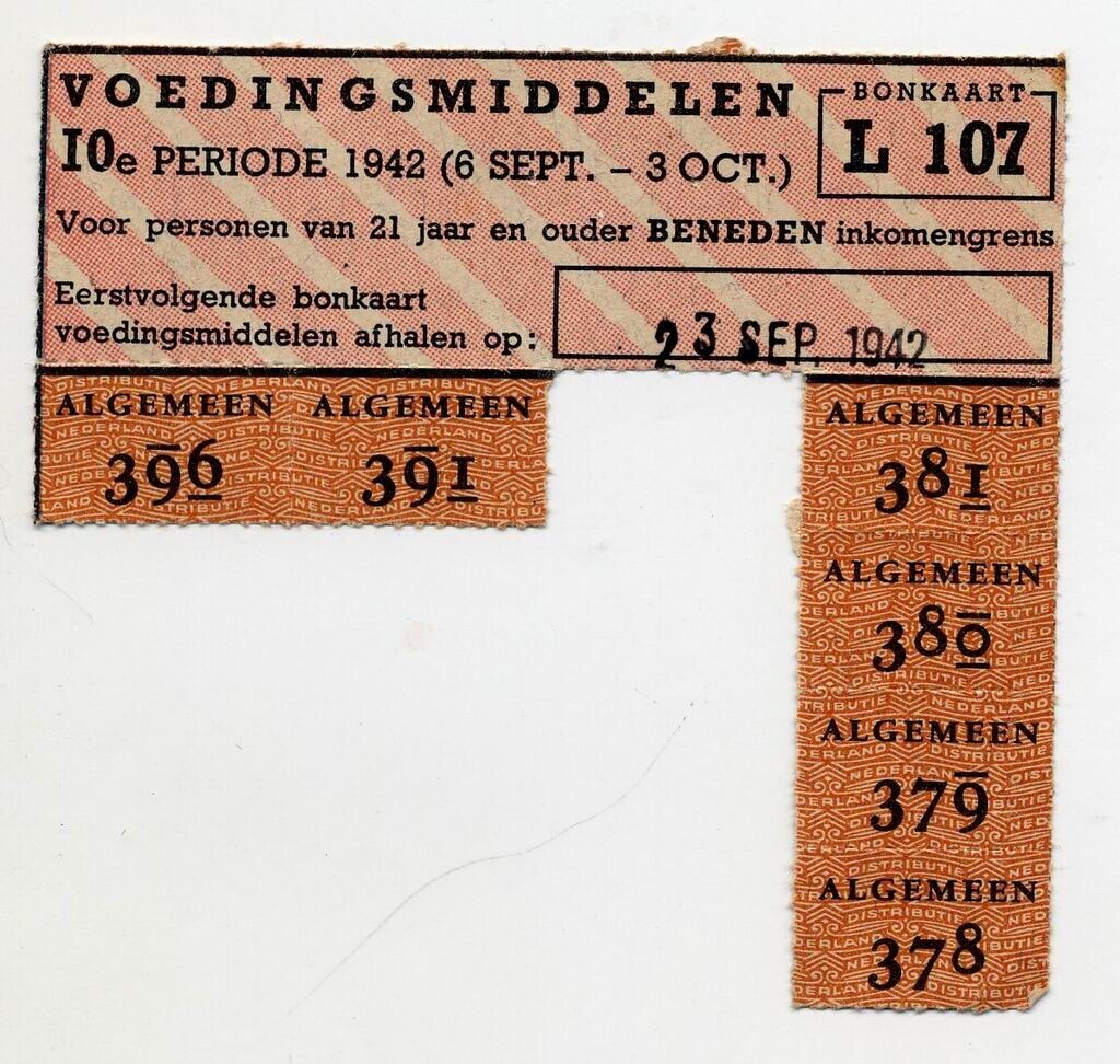 Gedeelte van een gebruikte bonkaart K 107 - Voedingsmiddelen 10e periode 1942 (6 sept. - 3 oct.) - Voor personen van 21 jaar en ouder beneden inkomengrens. - met roze, zwarte en oranje opdruk.