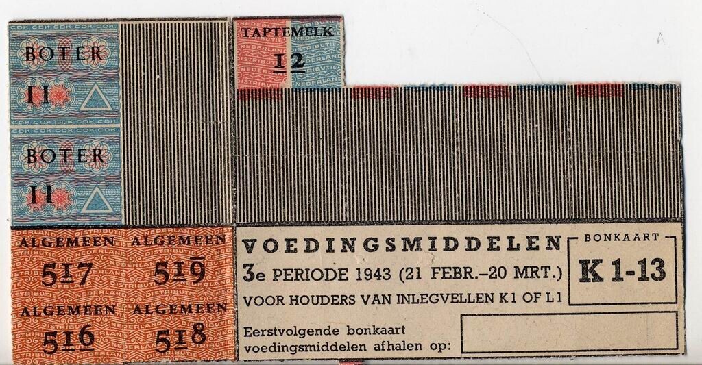 Gedeelte van een gebruikte bonkaart K 1-13 - Voedingsmiddelen 3e periode 1943 (21 febr. - 20 mrt.) - Voor houders van inlegvellen K1 of L1. - met zwarte, roze, blauwe en oranje opdruk.