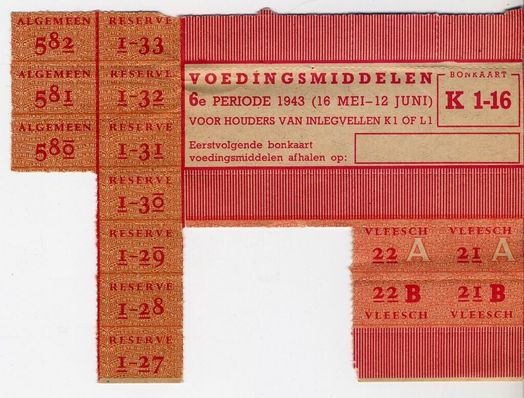 Gedeelte van een gebruikte bonkaart K 1-16 - Voedingsmiddelen 6e periode 1943 (16 mei - 12 juni) - Voor houders van inlegvellen K1 of L1. - met roze en oranje opdruk.