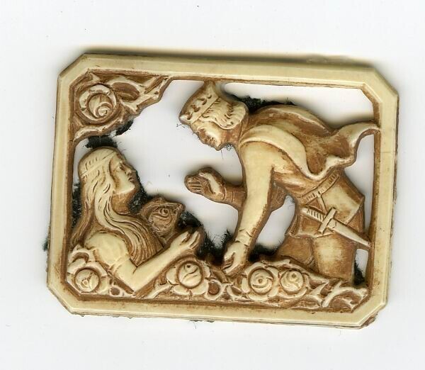 Een ovaal plastic speldje uit de serie speldjes met afbeeldingen uit sprookjes die werden uitgereikt tijdens de collectie op 27 en 28 december 1940 van de Winterhulp Nederland. Dit speldje geeft een scène weer uit het sprookje Doornroosje: afgebeeld is het moment dat Doornroosje net wakker is gekust door de prins.