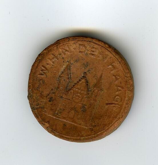 Een rond rood aardewerken collectespeldje van de Winterhulp Nederland uit de serie 'Bekende gebouwen' met in reliëf de voorstelling van de Ridderzaal van het Binnenhof te Den Haag met de tekst: "W.H.N. Den Haag". Uitgereikt tijdens de collecte op 14 en 15 november 1941.