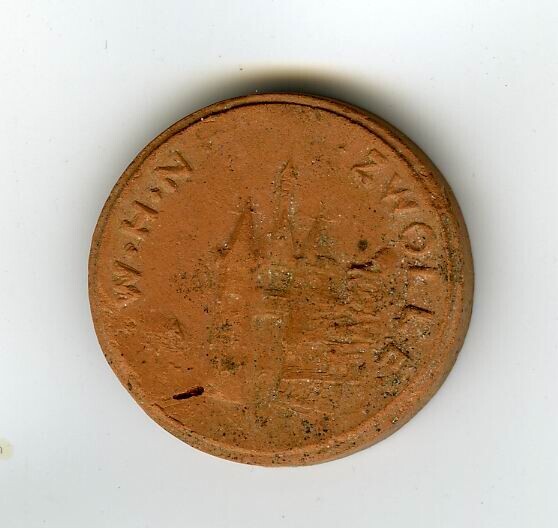 Een rond rood aardewerken collectespeldje van de Winterhulp Nederland uit de serie 'Bekende gebouwen' met in reliëf de voorstelling van de Sassenpoort te Zwolle met de tekst: "W.H.N. Zwolle". Uitgereikt tijdens de collecte op 14 en 15 november 1941.