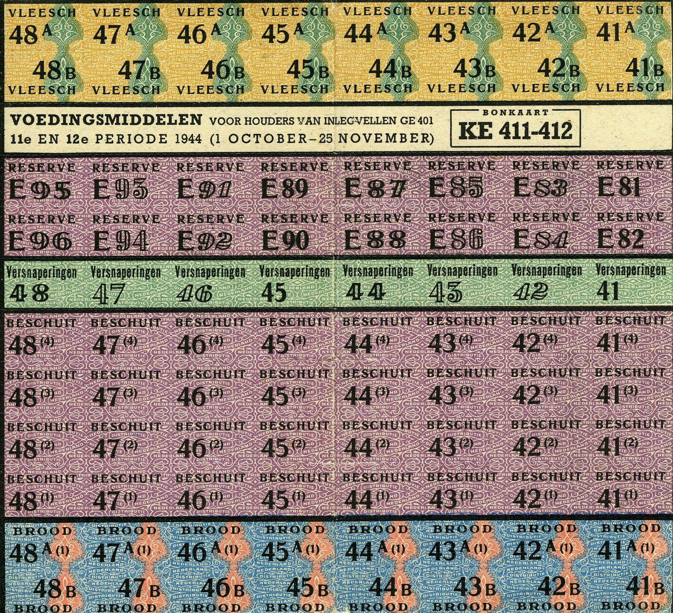 Complete bonkaart, serie KE 411-412: Voedingsmiddelen voor houders van inlegvellen GE401. 11e en 12e periode 1944 (1 october - 25 november). Voor vlees, versnaperingen, beschuit en brood.