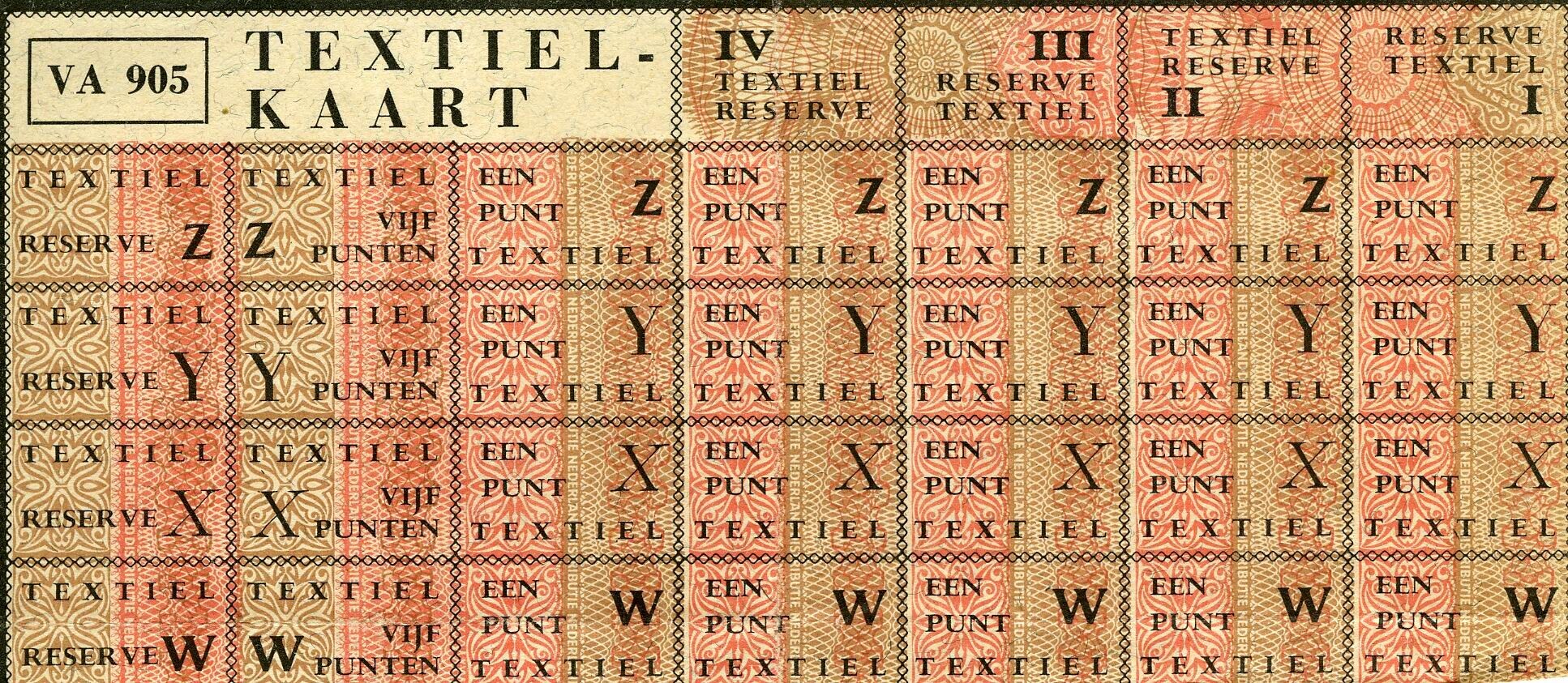 Een deel van een "Textielkaart VA 905 met roze, bruine en zwarte opdruk.