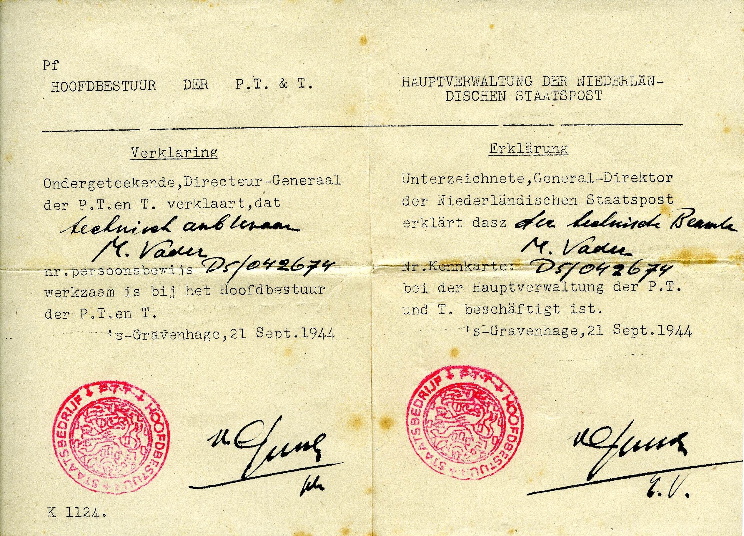 Een schrijven in het Duits en het Nederlands en ondertekend door de Directeur-Generaal der P.T.T. waarin wordt verklaard dat M. Vader, technisch ambtenaar bij het hoofdbestuur van de P.T.T. is. De verklaring is afgegeven te Den Haag op 21 september 1944.