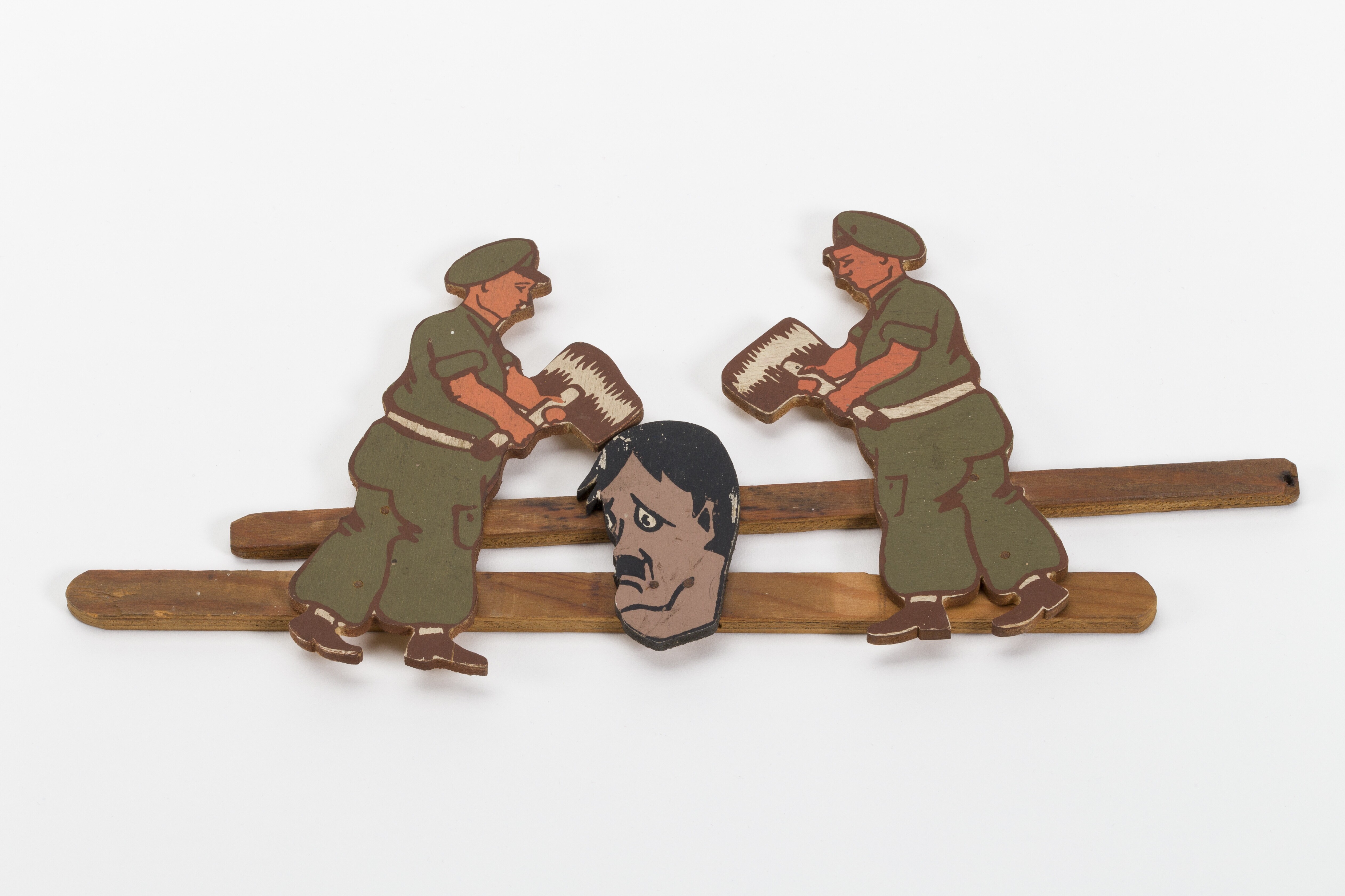 Een houten schuifspeeltje bestaande uit twee stokjes met het hoofd van Hitler in het midden. Aan weerskanten een man in groen uniform, vermoedelijk stelt hij een lid van de Binnenlandse Strijdkrachten voor, met een hamer. Door de twee stokjes heen en weer te bewegen slaat steeds één van de mannen met de hamer op het hoofd van Hitler.