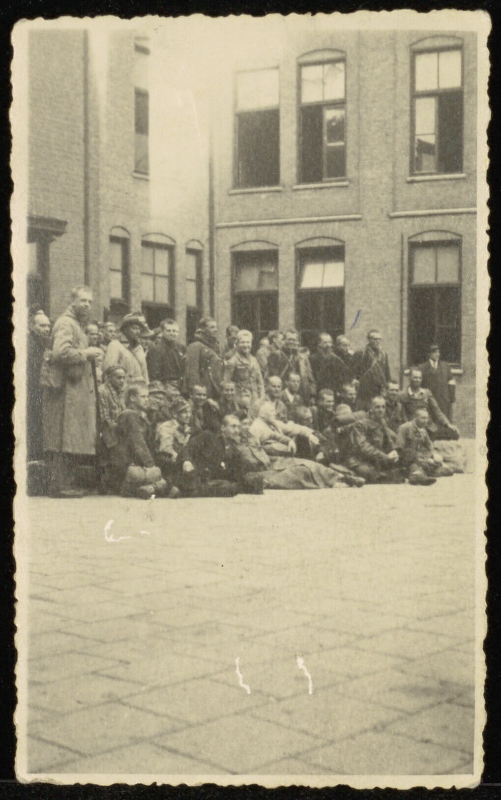 Een zwart-wit foto van een groep mensen op wat waarschijnlijk een binnenplaats is van een gebouw. Op de achterkant staat met pen geschreven: "Voorjaar 1945 na bevrijding aankomst Eindhoven". De foto is afgedrukt als ansichtkaart.