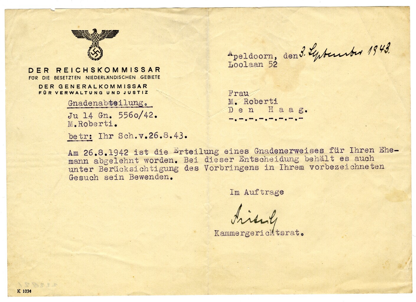 Een verklaring op 3 september 1943 afgegeven door de 'Kammergerichtsrat" namens "Der Generalkommissar für verwaltung und Justiz Gnadenabteilung" waarin de afwijzing op het verzoek om gratie van 26 augustus 1942 voor K. Roberti door M Roberti-Blakton, Den Haag, Torenstraat 134 wordt bevestigd.