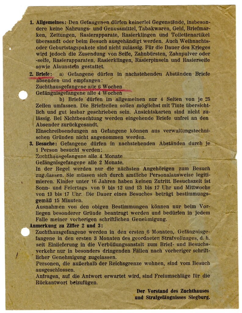 Een gedrukt blad papier met het algemene reglement voor strafgevangenen in Siegburg. De regels betreffen: Bezoek, Bezit en de Correspondentie.<br>
