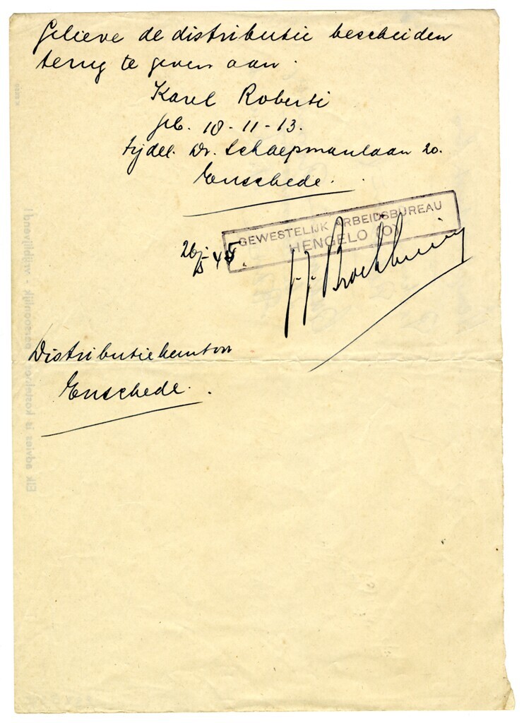 Op de achterkant van een deel van een blad papier is met pen een verzoek geschreven om "de distributiebescheiden terug te geven aan Karel Roberti, geb. 18-11-13, tijdelijk: Dr. Schaepmanlaan 20, Enschede" en ondertekend door J.J. Broekhuizen, 26/5-44, Distributiekantoor Enschede". Het briefje is afgestempeld door het "Gewestelijk arbeidsbureau (O)". Op de achterkant staan met potlood adressen geschreven die o.a. te maken hebben met repatriëring.