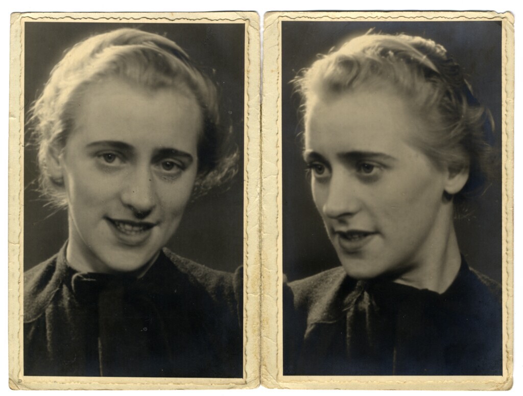 Twee zwart-wit portretfoto's één links voor driekwart en één en face genomen van mevrouw Margaretha Roberti-Blekton. De foto's zijn op twee stukken dik papier, die aan de achterkant met plakpapier aan elkaar zijn bevestigd. Op de achterkant is links met pen een schets gemaakt van een 'groeimeter' in de vorm van een ladder. De lengte van het kind wordt vanaf het 1e jaar tot en met het 3e jaar bijgehouden. Tevens staan daarbij de plaatsen genoteerd waar de heer K.J. Roberti zich op dat moment in gevangenschap bevindt. Rechts is met een schets van een lege groeimeter getekend met de data: "8 okt. 1941 - 8 okt. 1953" en "Den Haag Roberti, Karl, Zelle 542/13" en rechtsonder de paraaf van Roberti en de datum "28-3-'43".