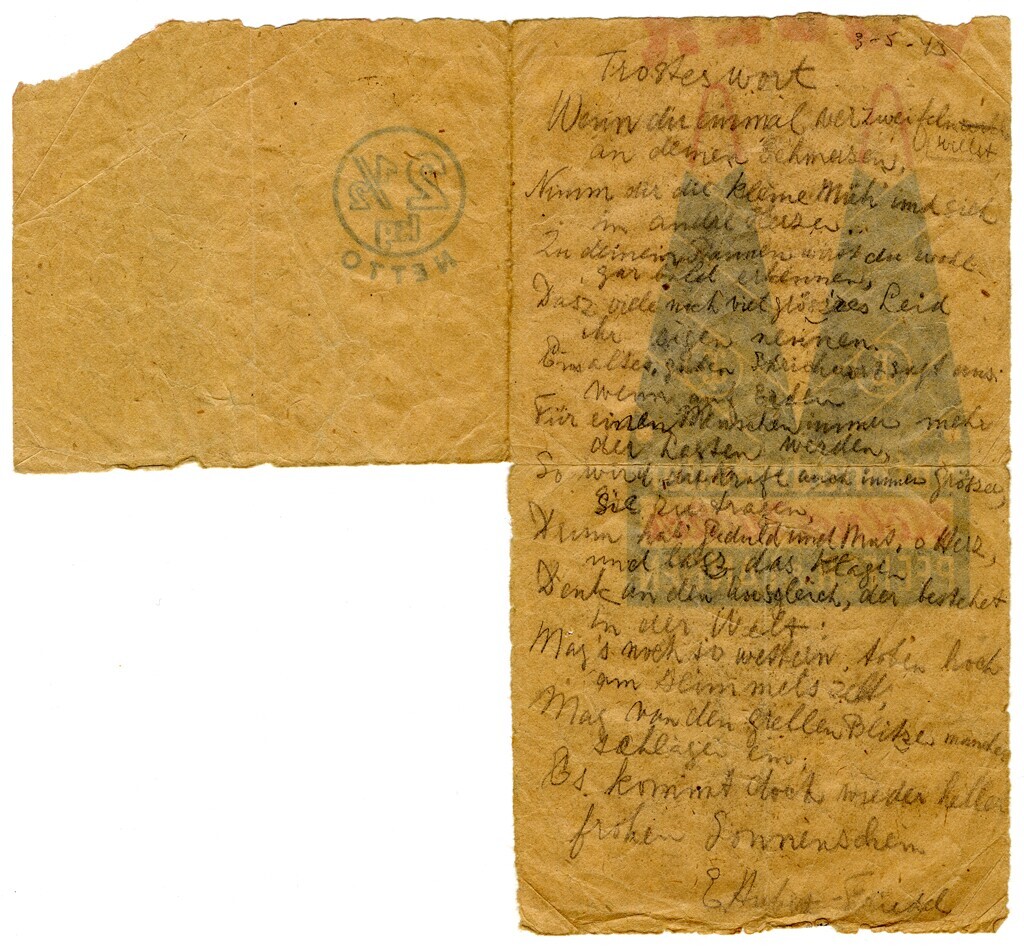 Een gedicht geschreven met potlood in het Duits met als titel "Trosteswort" en gedateerd: 3-5-43. Het gedicht is geschreven op de achterkant van een deel van een papieren suikerzak met de opdruk: "2 1/2 kg netto. Raffinade-Puder, Kölner Zucker, Pfeifer & Langen".<br>