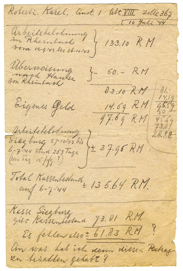 Op een stuk papier is met potlood een financieel overzicht geschreven van: "Roberti Karel , Aust. 1 Abt. VIII, zelle 367, 10 Juli '44". Op de achterkant enkele potlood aantekeningen.