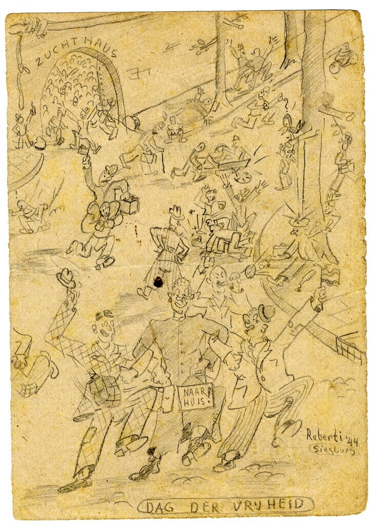 Een potloodtekening op de achterkant van een deel van een Duits formulier. Afgebeeld is een straat vol mensen die uit een poort met daarboven "Zuchthaus" komen. De meesten juichen, anderen vechten en één van hen ligt dronken onder een boom. Op de voorgrond drie mannen arm in arm, waarvan de middelste een bordje draagt met daarop: "Naar Huis!". Geheel onderaan: "Dag der Vrijheid”. Rechtsonder signering: "Roberti '44 Siegburg".