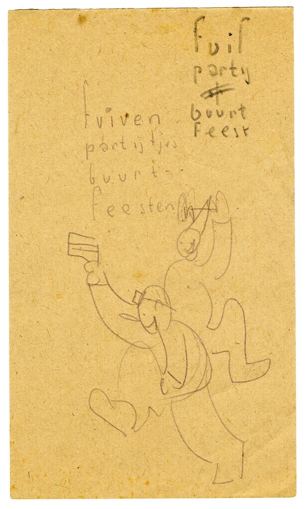 Een potlood schets van twee feestvierende mannen met vlaggetje in de hand en feestmuts op. Rechtsboven staat geschreven: "fuif-partij-buurt-feest" en "fuiven-partijtjes- buurt-feesten".