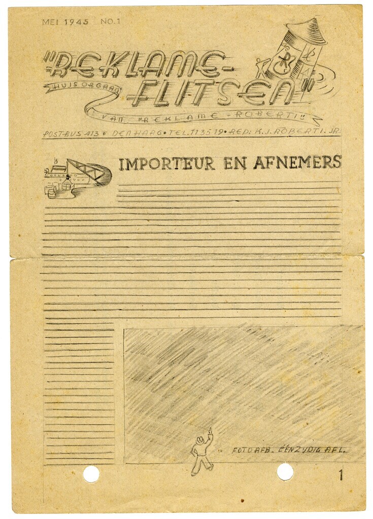Een ontwerptekening voor een reclameblaadje met potlood gemaakt op de achterkant van een Duits formulier. Linksbovenaan de datum: "Mei 1945 No. 1". Hieronder de kop: "'Reklame-flitsen'. Huisorgaan van 'Reklame-Roberti'" met rechts daarvan het logo van de studio bestaande uit een tekening van een mannetje dat een affiche met een grote "R" plakt op een reclamezuil. Onder dit alles: "Postbus 413. Den Haag. Tel. 113519. Red: K.J. Roberti.jr".<br>Onder de kop is links een kleine tekening gemaakt van een vrachtschip dat geladen wordt vanaf een kade. Rechts daarvan: "Importeur en Afnemers" met daaronder lege regels. Rechtsonder een tekening van een donker vlak met onderaan een klein mannetje. Rechts van het mannetje: "Fotoafb. Éénzijdige afl.".<br>