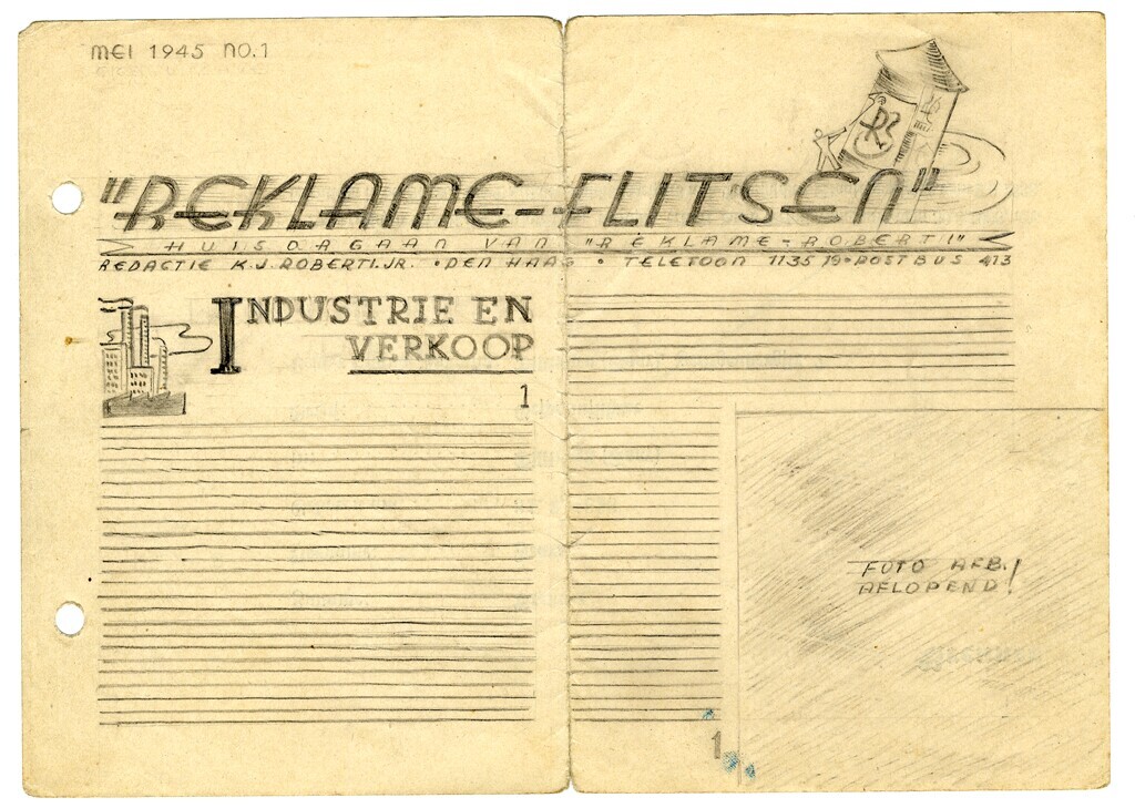 Een ontwerptekening voor een reclameblaadje met potlood gemaakt op de achterkant van een Duits formulier. Linksbovenaan de datum: "Mei 1945 No. 1". Hieronder de kop: "'Reklame-flitsen'. Huisorgaan van 'Reklame-Roberti'" met rechtsboven daarvan het logo van de studio bestaande uit een tekening van een mannetje dat een affiche met een grote "R" plakt op een reclamezuil. Onder dit alles: "Redactie K.J. Roberti. jr. . Den Haag . Telefoon 113519 . Postbus 413.". Onder de kop is links een kleine tekening gemaakt van een fabriek met rokende schoorstenen. Rechts daarvan: "Industrie en verkoop" met daaronder lege regels. Rechtsonder een tekening van een donker vlak met in het midden: "Foto afb. aflopend!".